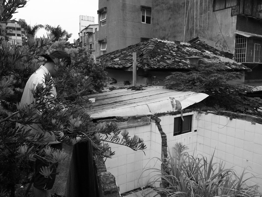 照片裡的風景是台北市京站旁一處日式房舍,位處此等地段,且建築物破敗,以至於我每次打從這經過,都覺得這是我與這棟房子的訣別。今日路過,那噩夢終於成真,國有地的身分也曝了光。而這裡原本有群貓,在有心人有計畫的捕捉、結紮、放養、定期放置乾式貓糧(不容易腐敗引起臭味或蚊蠅孳生)之下,簡直成了繁華大都會裡的貓之私樂園。今天的陽光,想必把地面上的磁磚曬得發燙,那些黑色的、玳瑁色的、黃色的、虎斑紋的,也在這酷暑烈日下,全部人間蒸發了。