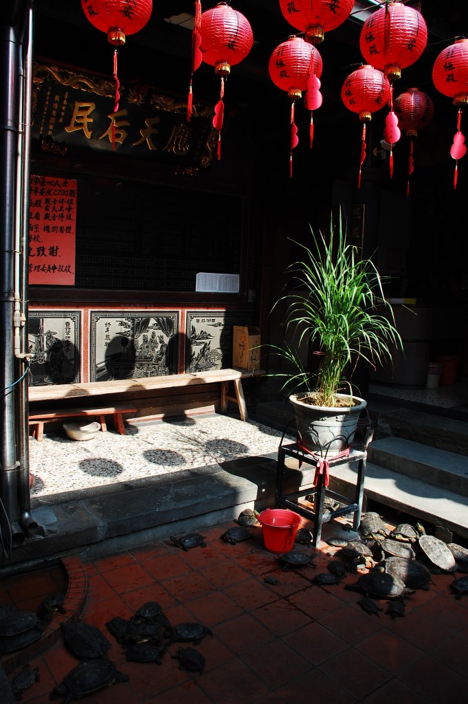本年最後一日,走進玉井北極殿,只見地上曬著太陽的烏龜,比起廟裡的各色人等,要來得多上許多。初見只覺詫異,隨即恍然大悟;依據來自民間傳說的印象指出:龜,連同蛇,兩者乃是玄天上帝腳下的兩名敗將,而龜普遍又有長壽象徵,且貌似溫和、行動遲緩,因此未曾另見一窩蛇的供養。